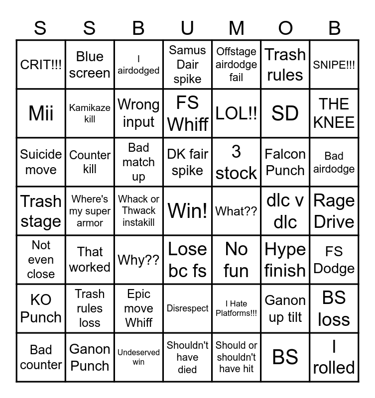 This bingo card has a free space and 48 words: I Hate Platforms!!!, SD, Shouldn't have died, Where's my super armor, Bad match up, Rage Drive, Blue screen, Ganon Punch, Trash rules, Lose bc fs, SNIPE!!!, Samus Dair spike, Falcon Punch, 3 stock, KO Punch, dlc v dlc, Mii, THE KNEE, Ganon up tilt, Offstage airdodge fail, LOL!!, Whack or Thwack instakill, CRIT!!!, Kamikaze kill, BS loss, Wrong input, Bad airdodge, Bad counter, DK fair spike, Counter kill, BS, What??, FS Dodge, Trash rules loss, Trash stage, No fun, Hype finish, Suicide move, Why??, Epic move Whiff, Not even close, I rolled, I airdodged, Undeserved win, FS Whiff, Disrespect, That worked and Should or shouldn't have hit.