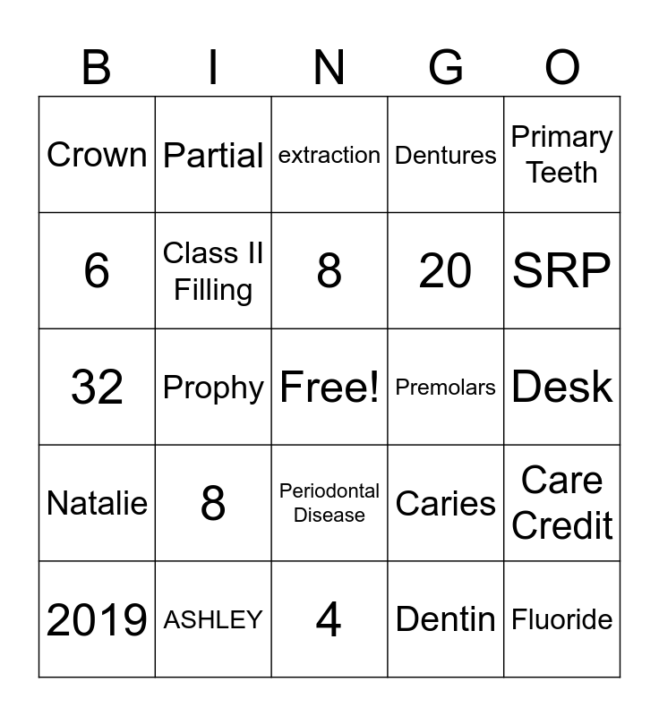 This bingo card has a free space and 29 words: 2019, SHELLY, Prophy, Root Canal Treatment, Crown, extraction, Class II Filling, 8, Premolars, ASHLEY, Desk, Fluoride, 4, Dentin, SRP, Enamel, Periodontal Disease, Natalie, Primary Teeth, 32, Caries, Filling, 20, 6, Dentures, Partial, Care Credit, 8 and 6 months.