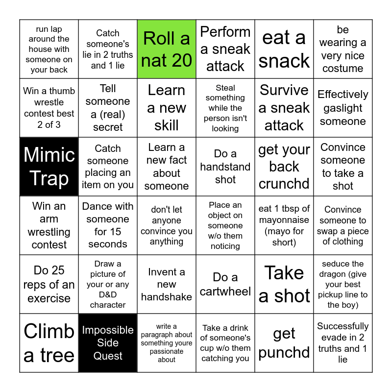 This bingo card has 40 words: Win an arm wrestling contest, Tell someone a (real) secret, solve a sudoku puzzle, Perform a sneak attack, eat 1 tbsp of mayonnaise (mayo for short), Convince someone to swap a piece of clothing, run lap around the house with someone on your back, Give Basil pets (it's the wise thing to do), Learn a new skill, Steal something while the person isn't looking, get your back crunchd, Effectively gaslight someone, Win a thumb wrestle contest best 2 of 3, Catch someone placing an item on you, Learn a new fact about someone, Do a handstand shot, get punchd, be wearing a very nice costume, Do 25 reps of an exercise, Catch someone's lie in 2 truths and 1 lie, don't let anyone convince you anything, Do a cartwheel, eat a snack, Convince someone to take a shot, Climb a tree, Draw a picture of your or any D&D character, Invent a new handshake, Take a drink of someone's cup w/o them catching you, Take a shot, Successfully evade in 2 truths and 1 lie, crack someone's back, Dance with someone for 15 seconds, write a paragraph about something youre passionate about, Place an object on someone w/o them noticing, Survive a sneak attack, seduce the dragon (give your best pickup line to the boy), Mimic Trap, Impossible Side Quest, Roll a nat 20 and find the monster.
