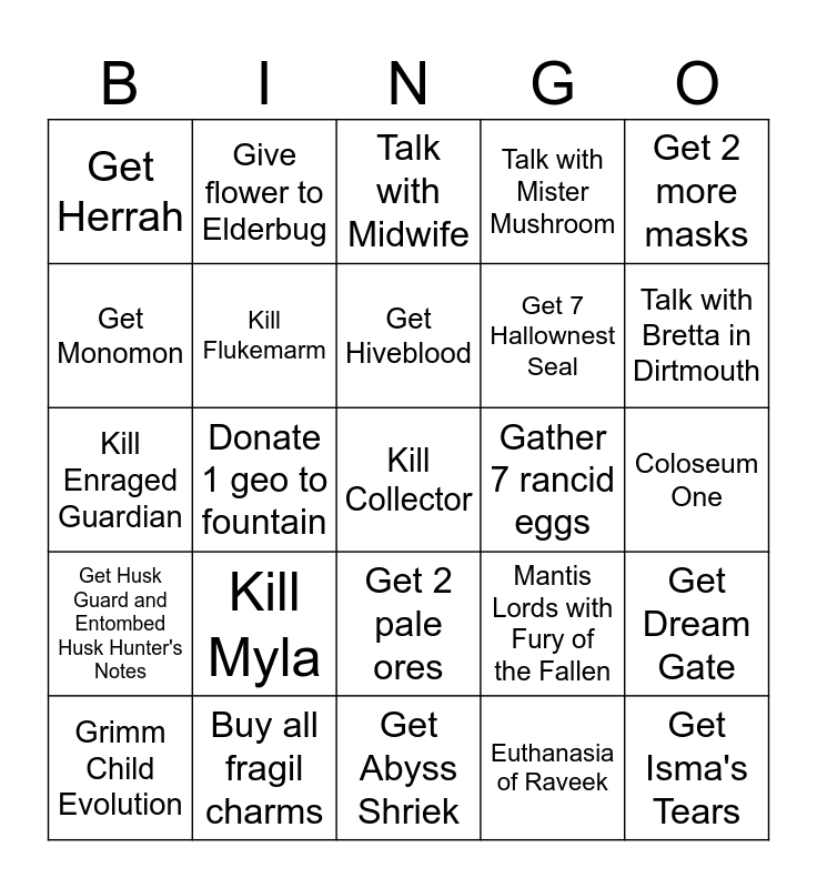 This bingo card has 25 words: Kill Myla, Get Abyss Shriek, Get Hiveblood, Grimm Child Evolution, Get 2 more masks, Get Herrah, Get Monomon, Give flower to Elderbug, Gather 7 rancid eggs, Get 2 pale ores, Get 7 Hallownest Seal, Kill Enraged Guardian, Mantis Lords with Fury of the Fallen, Get Dream Gate, Kill Flukemarm, Get Isma's Tears, Coloseum One, Talk with Midwife, Talk with Bretta in Dirtmouth, Donate 1 geo to fountain, Kill Collector, Buy all fragil charms, Get Husk Guard and Entombed Husk Hunter's Notes, Talk with Mister Mushroom and Euthanasia of Raveek.