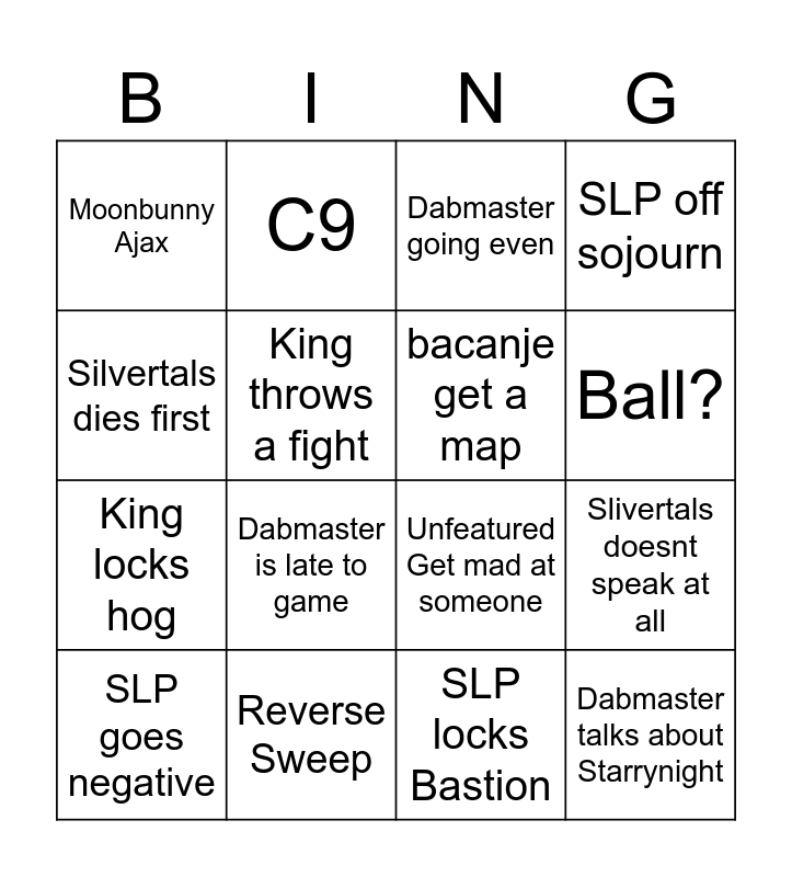 This bingo card has 16 words: Reverse Sweep, Slivertals doesnt speak at all, Dabmaster going even, Moonbunny Ajax, King locks hog, C9, Unfeatured Get mad at someone, SLP locks Bastion, Silvertals dies first, King throws a fight, SLP goes negative, SLP off sojourn, Dabmaster is late to game, Ball?, bacanje get a map and Dabmaster talks about Starrynight.