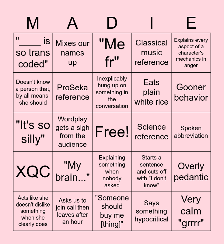 This bingo card has a free space and 27 words: Starts a sentence and cuts off with "I don't know", Only starts paying attention once dogs are mentioned, Eats plain white rice, "Someone should buy me [thing]", Doesn't know a person that, by all means, she should, "Me fr", Mixes our names up, XQC, Science reference, Overly pedantic, "It's so silly", Classical music reference, Acts like she doesn't dislike something when she clearly does, Asks us to join call then leaves after an hour, Gooner behavior, Denies allegations, ProSeka reference, Inexplicably hung up on something in the conversation, "My brain...", "____ is so trans coded", Spoken abbreviation, Says something hypocritical, Wordplay gets a sigh from the audience, Very calm "grrrr", Explaining something when nobody asked, Explains every aspect of a character's mechanics in anger and Mean for no reason </3.