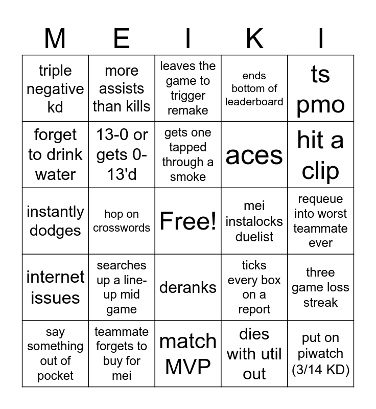 This bingo card has a free space and 37 words: mutes a teammate's comms, "i couldn't hear over my music", encounters transphobe, 13-0 or gets 0-13'd, three game loss streak, searches up a line-up mid game, gets one tapped through a smoke, encounters a sexist, ts pmo, yell at duo/teammate, hop on crosswords, ends bottom of leaderboard, put on piwatch (3/14 KD), requeue into worst teammate ever, forget to drink water, internet issues, "drop me your skin", leaves the game to trigger remake, deranks, mei instalocks duelist, triple negative kd, hit a clip, say something out of pocket, match MVP, loses an overtime game, dies with util out, more assists than kills, mei gets classic right clicked, mei confuses teammate with comms, fumbles a perfect flank/unaware player, forgets to buy for teammate, teammate forgets to buy for mei, instantly dodges, falls for ragebait, ticks every box on a report, aces and gets aced.