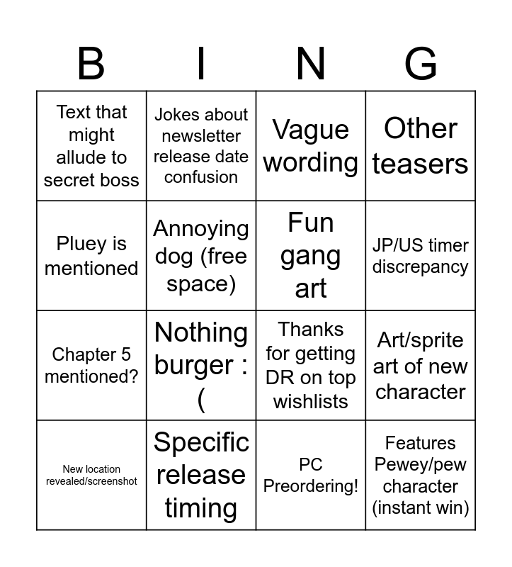 This bingo card has 16 words: Specific release timing, Art/sprite art of new character, Vague wording, Text that might allude to secret boss, Chapter 5 mentioned?, Jokes about newsletter release date confusion, Thanks for getting DR on top wishlists, PC Preordering!, Pluey is mentioned, Annoying dog (free space), New location revealed/screenshot, Other teasers, Nothing burger :(, JP/US timer discrepancy, Fun gang art and Features Pewey/pew character (instant win).