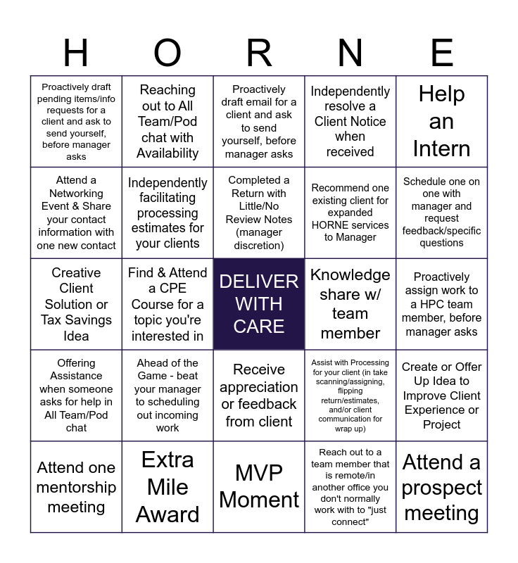 This bingo card has a free space and 41 words: Attend a client call, Creative Client Solution or Tax Savings Idea, Create a proposal & participate in pricing discussion, Independently facilitating processing estimates for your clients, Extra Mile Award, Receive appreciation or feedback from client, Completed a Return with Little/No Review Notes (manager discretion), Take notes on a client call, Help an Intern, Offering Assistance when someone asks for help in All Team/Pod chat, Find & Attend a CPE Course for a topic you're interested in, Independently resolve a Client Notice when received, Attend a prospect meeting, Proactively assign work to a HPC team member, before manager asks, Knowledge share w/ team member, Ahead of the Game - beat your manager to scheduling out incoming work, Train a HPC team member on a topic they're struggling with, Proactively draft pending items/info requests for a client and ask to send yourself, before manager asks, Offer up an action item post client call (next steps), Proactively draft email for a client and ask to send yourself, before manager asks, Create or Offer Up Idea to Improve Client Experience or Project, Independently Research a Client/Return Problem, Save Results to the file & discuss with team, MVP Moment, Recommend one existing client for expanded HORNE services to Manager, Knowledge Share on Team or Pod Call, Facilitate training or initiative to help train our HPC Team, Reach out to a team member that is remote/in another office you don't normally work with to "just connect", Have an internal client meeting with manager to brainstorm ways to elevate your role & responsibilities on project, Schedule one on one with manager and request feedback/specific questions, Attend an in-person client meeting, Help a HPC team member outside of 8-5 "our" time with questions, Reaching out to All Team/Pod chat with Availability, Attend one mentorship meeting, On-board new client (setting up prior year return in CCH, Read Me document for the file, team meeting, etc), Assist with Processing for your client (in take scanning/assigning, flipping return/estimates, and/or client communication for wrap up), Attend a Networking Event & Share your contact information with one new contact, Recommend one existing client for expanded HORNE services to Manager, Send reviewer 3 items you noticed when "analyzing" return with print preview when sending to review, Offer up an idea for improvement for our team to management team, Catch AND correct something we've been doing incorrectly on a return in previous years and Impact Maker.