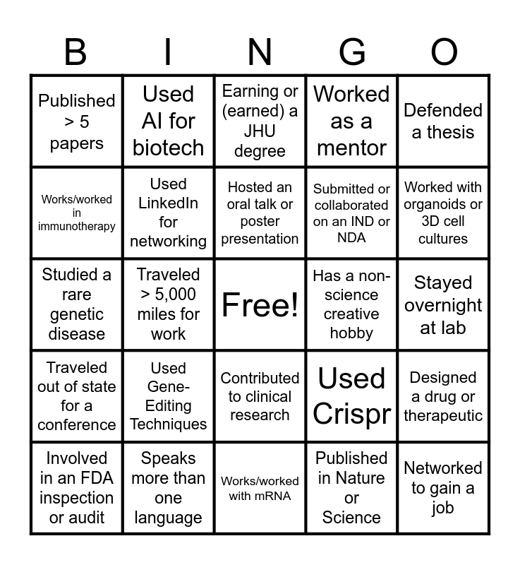 This bingo card has a free space and 24 words: Used Gene-Editing Techniques, Speaks more than one language, Hosted an oral talk or poster presentation, Involved in an FDA inspection or audit, Defended a thesis, Published > 5 papers, Works/worked in immunotherapy, Used AI for biotech, Has a non-science creative hobby, Contributed to clinical research, Submitted or collaborated on an IND or NDA, Studied a rare genetic disease, Used Crispr, Designed a drug or therapeutic, Used LinkedIn for networking, Published in Nature or Science, Stayed overnight at lab, Earning or (earned) a JHU degree, Worked with organoids or 3D cell cultures, Traveled > 5,000 miles for work, Networked to gain a job, Traveled out of state for a conference, Worked as a mentor and Works/worked with mRNA.