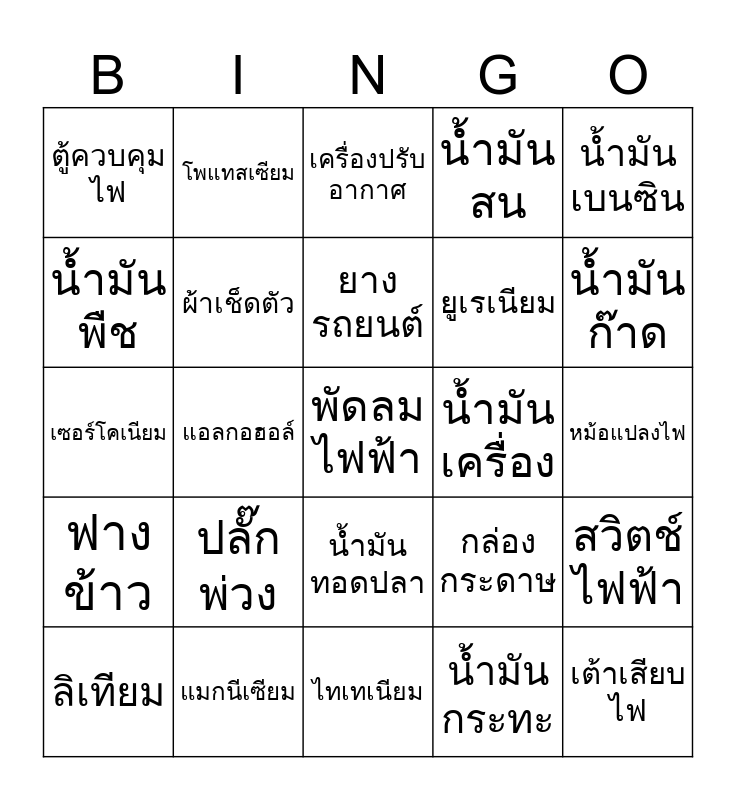 This bingo card has 36 words: Free!, ไม้, หนังสือพิมพ์, ผ้าเช็ดตัว, กล่องกระดาษ, ฟางข้าว, ยางรถยนต์, พลาสติกเก้าอี้, น้ำมันเบนซิน, ทินเนอร์สี, แอลกอฮอล์, น้ำมันสน, สีสเปรย์, น้ำมันเครื่อง, น้ำมันก๊าด, ตู้ควบคุมไฟ, เต้าเสียบไฟ, ปลั๊กพ่วง, พัดลมไฟฟ้า, เครื่องปรับอากาศ, หม้อแปลงไฟ, สวิตช์ไฟฟ้า, แมกนีเซียม, ลิเทียม, ไทเทเนียม, โพแทสเซียม, เซอร์โคเนียม, อลูมิเนียมผง, ยูเรเนียม, น้ำมันพืช, น้ำมันหมู, น้ำมันทอดไก่, น้ำมันกระทะ, น้ำมันทอดปลา, น้ำมันฟาสต์ฟู้ด and ไขมันสัตว์.