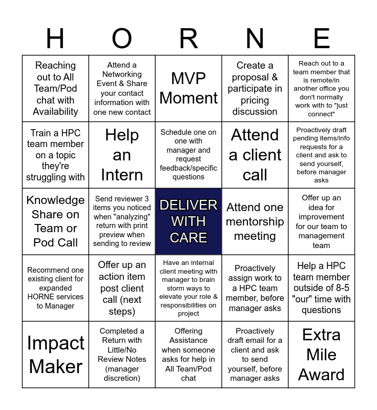 This bingo card has a free space and 40 words: Attend an in-person client meeting, Knowledge Share on Team or Pod Call, Independently facilitating processing estimates for your clients, Help an Intern, Completed a Return with Little/No Review Notes (manager discretion), Have an internal client meeting with manager to brain storm ways to elevate your role & responsibilities on project, Schedule one on one with manager and request feedback/specific questions, Find & Attend a CPE Course for a topic you're interested in, Reach out to a team member that is remote/in another office you don't normally work with to "just connect", Recommend one existing client for expanded HORNE services to Manager, Send reviewer 3 items you noticed when "analyzing" return with print preview when sending to review, Create a proposal & participate in pricing discussion, Extra Mile Award, Offer up an idea for improvement for our team to management team, Attend one mentorship meeting, Offer up an action item post client call (next steps), Ahead of the Game - beat your manager to scheduling out incoming work, Reaching out to All Team/Pod chat with Availability, Create or Offer Up Idea to Improve Client Experience or Project, MVP Moment, Help a HPC team member outside of 8-5 "our" time with questions, Proactively draft email for a client and ask to send yourself, before manager asks, Attend a client call, Train a HPC team member on a topic they're struggling with, Take notes on a client call, Receive appreciation or feedback from client, Creative Client Solution or Tax Savings Idea, Attend a prospect meeting, Knowledge Share with a teammember who needs help, Independently Research a Client/Return Problem, Save Results to the file & discuss with team, Independently resolve a Client Notice when received, Impact Maker, Facilitate training or initiative to help train our HPC Team, Proactively assign work to a HPC team member, before manager asks, Proactively draft pending items/info requests for a client and ask to send yourself, before manager asks, Offering Assistance when someone asks for help in All Team/Pod chat, On-board new client (setting up prior year return in CCH, Read Me document for the file, team meeting, etc), Assist with Processing for your client (in take scanning/assigning, flipping return/estimates, and/or client communication for wrap up), Attend a Networking Event & Share your contact information with one new contact and Catch AND Correct something we've been doing incorrectly on a return in previous years.