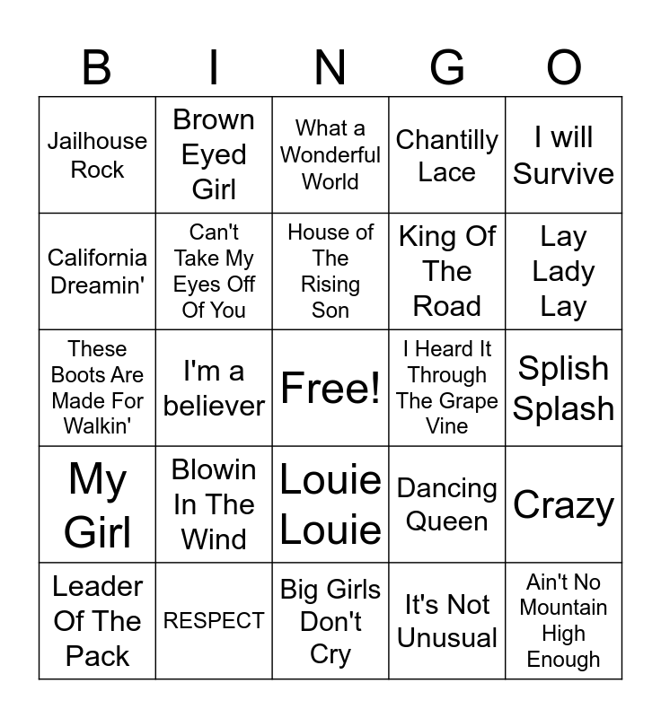This bingo card has a free space and 49 words: ABC, Ain't No Mountain High Enough, Be My Baby, Big Girls Don't Cry, Blowin In The Wind, Born To Be Wild, Brown Eyed Girl, Burning Ring Of Fire, California Dreamin', Can't Help Fallin'' In Love, Can't Take My Eyes Off Of You, Chantilly Lace, Crazy, Dancing Queen, Day Dream Believer, Good Vibrations, House of The Rising Son, I Heard It Through The Grape Vine, I Got You Babe, I will Survive, I'm a believer, It's Not Unusual, Jailhouse Rock, King Of The Road, La Bomba, Lay Lady Lay, Leader Of The Pack, Let The Sunshine In, Louie Louie, My Girl, On The Dock Of The Bay, Only The Lonely, Pretty Woman, Puff The Magic Dragon, RESPECT, She Loves You, Singing In The Rain, Son Of A Preacher Man, Splish Splash, Stand By Me, Stand By Your Man, Sweet Caroline, The Sound Of Silence, The Twist, These Boots Are Made For Walkin', What a Wonderful World, Wichita Lineman, You Can't Hurry Love and You Really Got a Hold On Me.