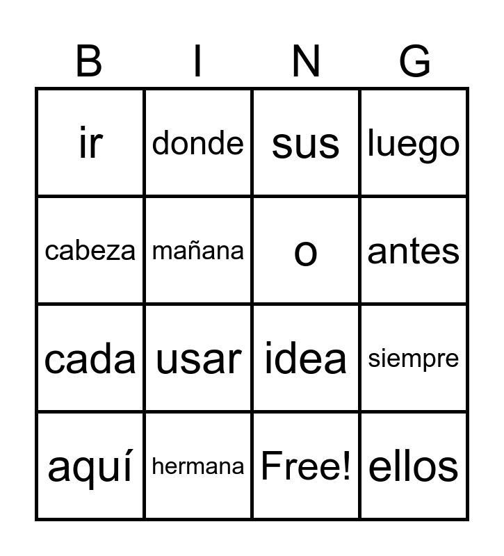 This bingo card has 16 words: aquí, hermana, sus, luego, cabeza, donde, idea, siempre, ir, mañana, Free!, antes, cada, usar, o and ellos.