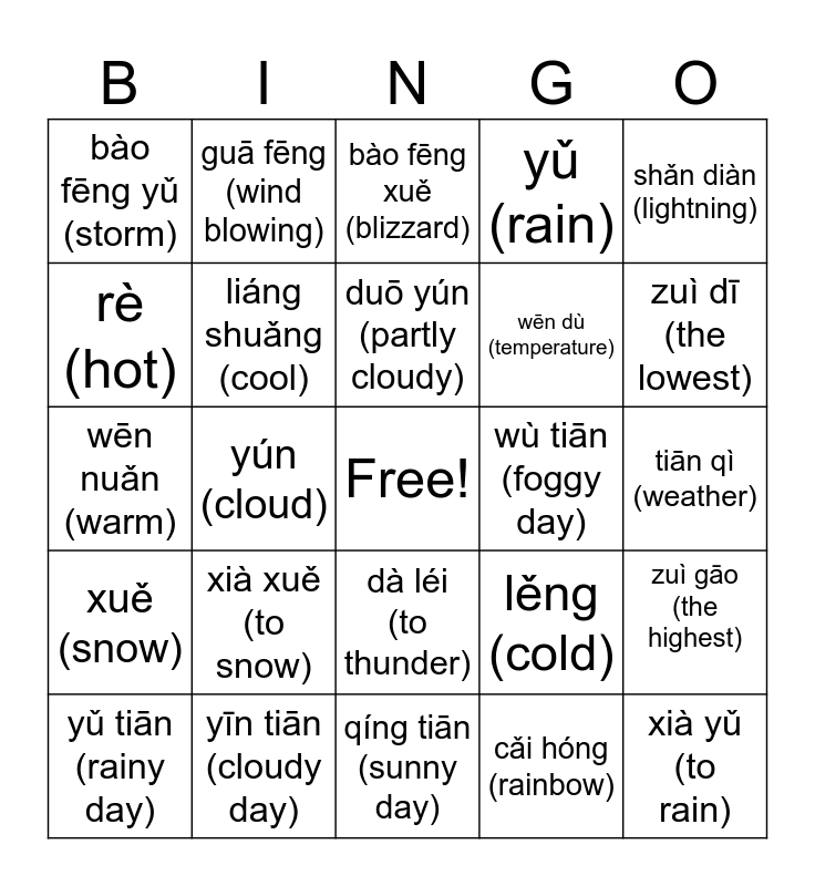 This bingo card has a free space and 24 words: xià xuě (to snow), yīn tiān (cloudy day), duō yún (partly cloudy), yǔ tiān (rainy day), shǎn diàn (lightning), bào fēng yǔ (storm), rè (hot), guā fēng (wind blowing), wù tiān (foggy day), dà léi (to thunder), wēn dù (temperature), wēn nuǎn (warm), lěng (cold), zuì gāo (the highest), liáng shuǎng (cool), cǎi hóng (rainbow), tiān qì (weather), bào fēng xuě (blizzard), zuì dī (the lowest), yún (cloud), xià yǔ (to rain), xuě (snow), yǔ (rain) and qíng tiān (sunny day).