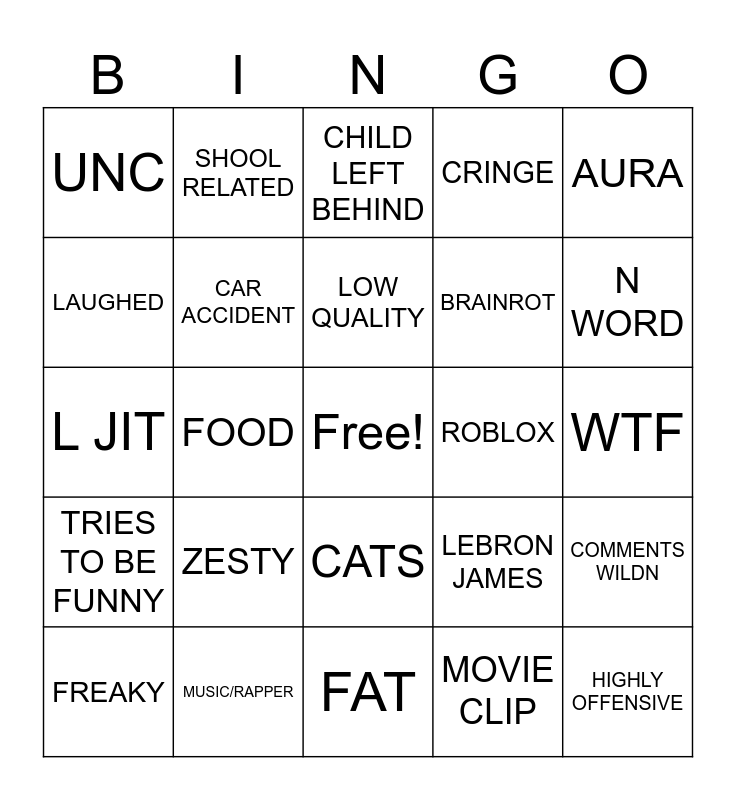 This bingo card has a free space and 24 words: ZESTY, MUSIC/RAPPER, LOW QUALITY, FREAKY, AURA, UNC, LAUGHED, SHOOL RELATED, ROBLOX, CATS, BRAINROT, L JIT, LEBRON JAMES, COMMENTS WILDN, CAR ACCIDENT, MOVIE CLIP, WTF, CHILD LEFT BEHIND, N WORD, FOOD, HIGHLY OFFENSIVE, TRIES TO BE FUNNY, CRINGE and FAT.