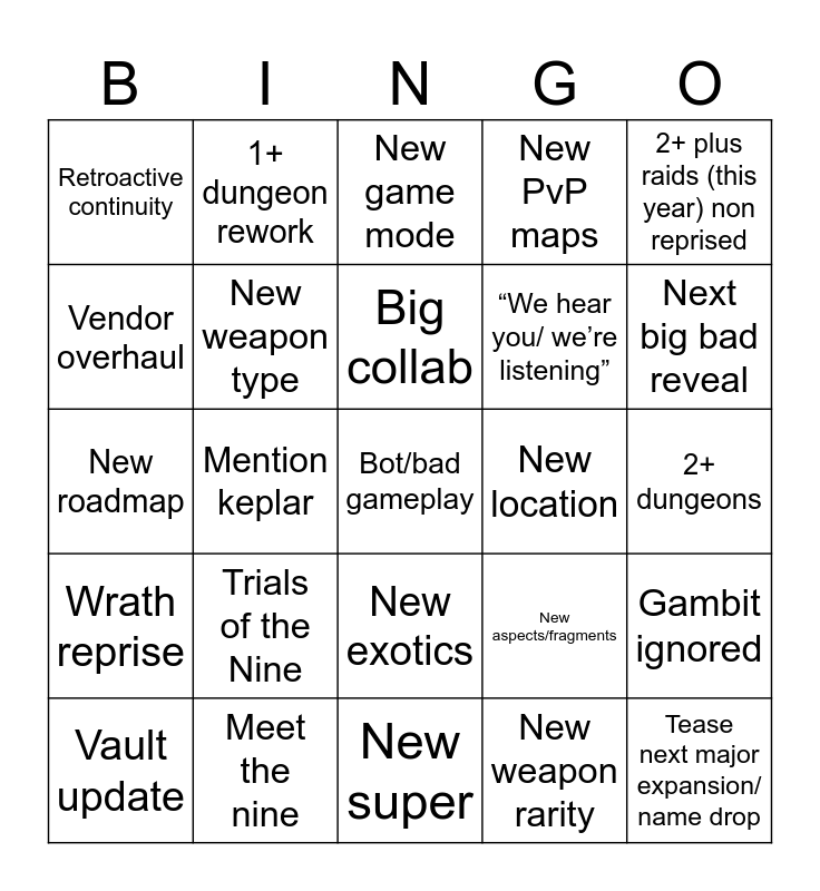This bingo card has a free space and 24 words: Trials of the Nine, Meet the nine, Big collab, Vault update, 2+ plus raids (this year) non reprised, Retroactive continuity, Vendor overhaul, 1+ dungeon rework, New location, New exotics, “We hear you/ we’re listening”, New roadmap, New aspects/fragments, Gambit ignored, New weapon type, New weapon rarity, 2+ dungeons, New game mode, Next big bad reveal, Mention keplar, Tease next major expansion/ name drop, Wrath reprise, New PvP maps and New super.