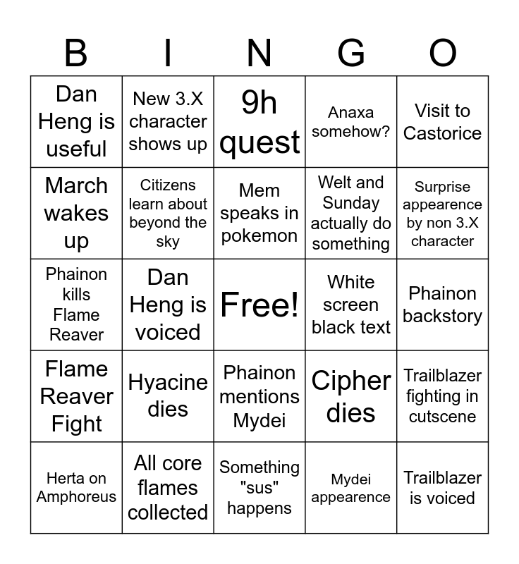 This bingo card has a free space and 24 words: Hyacine dies, All core flames collected, Mem speaks in pokemon, Herta on Amphoreus, Visit to Castorice, Dan Heng is useful, March wakes up, New 3.X character shows up, White screen black text, Phainon mentions Mydei, Welt and Sunday actually do something, Phainon kills Flame Reaver, Cipher dies, Trailblazer fighting in cutscene, Citizens learn about beyond the sky, Mydei appearence, Phainon backstory, 9h quest, Surprise appearence by non 3.X character, Dan Heng is voiced, Trailblazer is voiced, Flame Reaver Fight, Anaxa somehow? and Something "sus" happens.