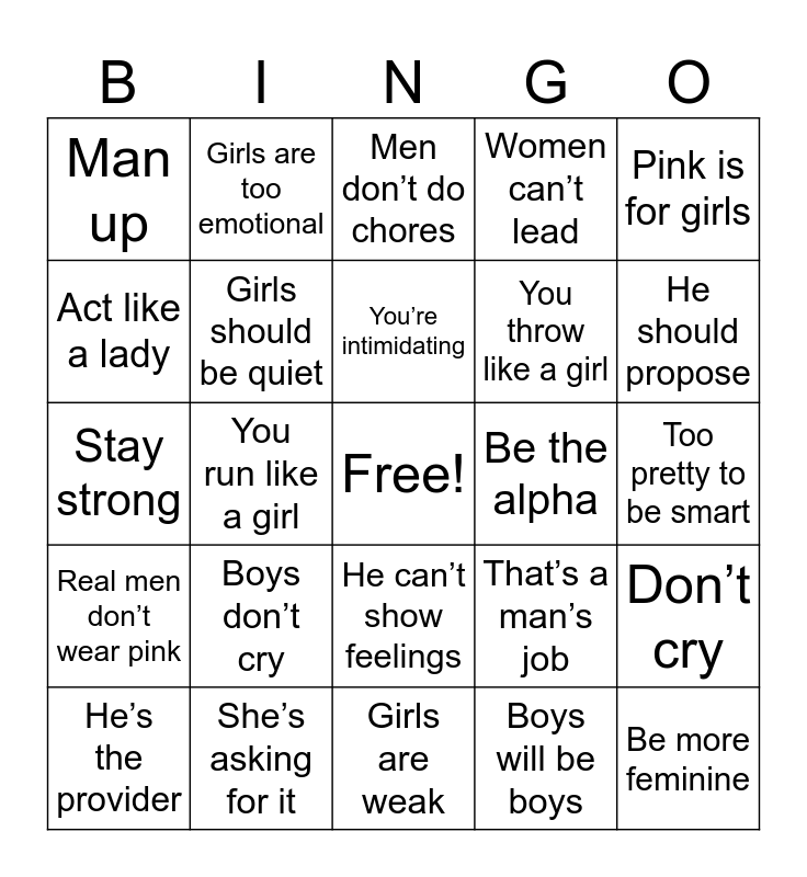 This bingo card has a free space and 24 words: Boys don’t cry, She’s asking for it, You’re intimidating, He’s the provider, Pink is for girls, Man up, Act like a lady, Girls are too emotional, Be the alpha, He can’t show feelings, You throw like a girl, Stay strong, That’s a man’s job, Don’t cry, Girls should be quiet, Boys will be boys, Too pretty to be smart, Men don’t do chores, He should propose, You run like a girl, Be more feminine, Real men don’t wear pink, Women can’t lead and Girls are weak.