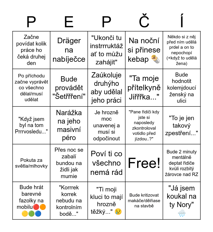 This bingo card has 27 words: Free!, "Já jsem koukal na ty Nory" 🌧️, "Ta moje přítelkyně Jiřřřka...", "Ti moji kluci to mají hrozně těžký..." 😢, Po příchodu začne vyprávět co všechno dělal/musí udělat, "Ukonči tu instrrruktáž ať to můžu zahájit", Dräger na nabíječce, Pokuta za světla/mlhovky, "Pane řidiči kdy jste si naposledy zkontroloval votidlo před jízdou..?", Bude 2 minuty mentálně deptat řidiče kvůli rozbitý žárovce nad RZ, "Když jsem byl na tom Prrrvosledu...", Na noční si přinese kebap 🌯, Bude hrát barevné fazolky na mobilu🔴🟠🟡🟢🔵, "Korrrek korrek nebudu na kontrolním bodě...", Bude hodnotit kolemjdoucí ženský na ulici, Vezme si lístek na výjezd z námka a pak do něj bude 20s čumět, Bude provádět "Šetřřření", Zaúkoluje druhýho aby udělal jeho práci, Přes noc se zabalí bundou na židli jak mumie, Začne povídat kolik práce ho čeká druhej den, "To je jen takový zpestření...", Bude kritizovat makáče/dělňase na stavbě, Narážka na jeho masivní péro, Je hrozně moc unavenej a musí si odpočinout, Poví ti co všechno nemá rád, Někdo si z něj před ním udělá prdel a on to nepochopí (+když to udělá žena) and Bude se ptát na výsledky.