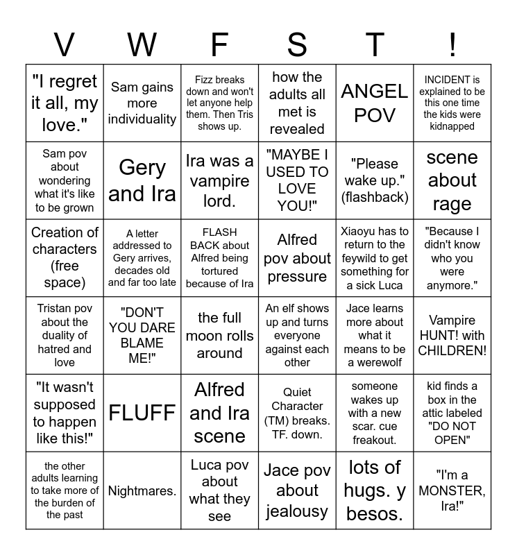 This bingo card has 36 words: Quiet Character (TM) breaks. TF. down., Alfred and Ira scene, Jace pov about jealousy, Sam pov about wondering what it's like to be grown, Tristan pov about the duality of hatred and love, Alfred pov about pressure, Gery and Ira, Luca pov about what they see, ANGEL POV, someone wakes up with a new scar. cue freakout., scene about rage, how the adults all met is revealed, kid finds a box in the attic labeled "DO NOT OPEN", A letter addressed to Gery arrives, decades old and far too late, "MAYBE I USED TO LOVE YOU!", "I regret it all, my love.", "It wasn't supposed to happen like this!", Xiaoyu has to return to the feywild to get something for a sick Luca, Creation of characters (free space), Fizz breaks down and won't let anyone help them. Then Tris shows up., FLASH BACK about Alfred being tortured because of Ira, "DON'T YOU DARE BLAME ME!", An elf shows up and turns everyone against each other, the full moon rolls around, Jace learns more about what it means to be a werewolf, Sam gains more individuality, "Please wake up." (flashback), Nightmares., Ira was a vampire lord., INCIDENT is explained to be this one time the kids were kidnapped, "I'm a MONSTER, Ira!", the other adults learning to take more of the burden of the past, Vampire HUNT! with CHILDREN!, "Because I didn't know who you were anymore.", FLUFF and lots of hugs. y besos..