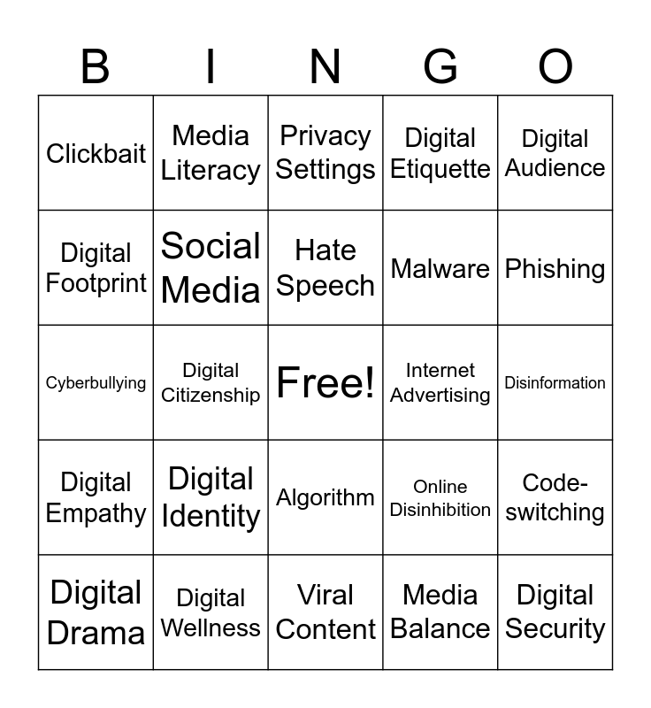 This bingo card has a free space and 24 words: Digital Drama, Digital Identity, Hate Speech, Media Balance, Digital Audience, Clickbait, Media Literacy, Privacy Settings, Internet Advertising, Disinformation, Cyberbullying, Social Media, Online Disinhibition, Code-switching, Digital Footprint, Digital Wellness, Viral Content, Digital Etiquette, Phishing, Digital Empathy, Digital Citizenship, Algorithm, Malware and Digital Security.