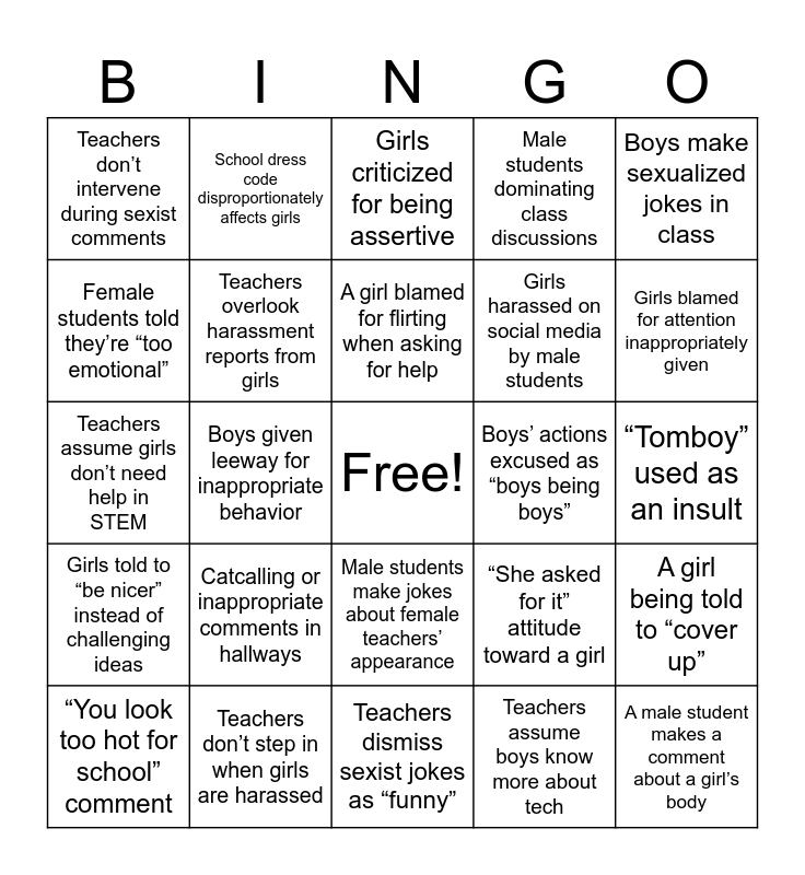 This bingo card has a free space and 25 words: Catcalling or inappropriate comments in hallways, Teachers dismiss sexist jokes as “funny”, A girl blamed for flirting when asking for help, “You look too hot for school” comment, Boys make sexualized jokes in class, Teachers don’t intervene during sexist comments, Female students told they’re “too emotional”, School dress code disproportionately affects girls, Boys’ actions excused as “boys being boys”, Male students make jokes about female teachers’ appearance, Girls harassed on social media by male students, Teachers assume girls don’t need help in STEM, “She asked for it” attitude toward a girl, A girl being told to “cover up”, Teachers overlook harassment reports from girls, “Real men don’t do that” comment, “Tomboy” used as an insult, Girls criticized for being assertive, Girls blamed for attention inappropriately given, Boys given leeway for inappropriate behavior, A male student makes a comment about a girl’s body, Teachers don’t step in when girls are harassed, Girls told to “be nicer” instead of challenging ideas, Male students dominating class discussions and Teachers assume boys know more about tech.