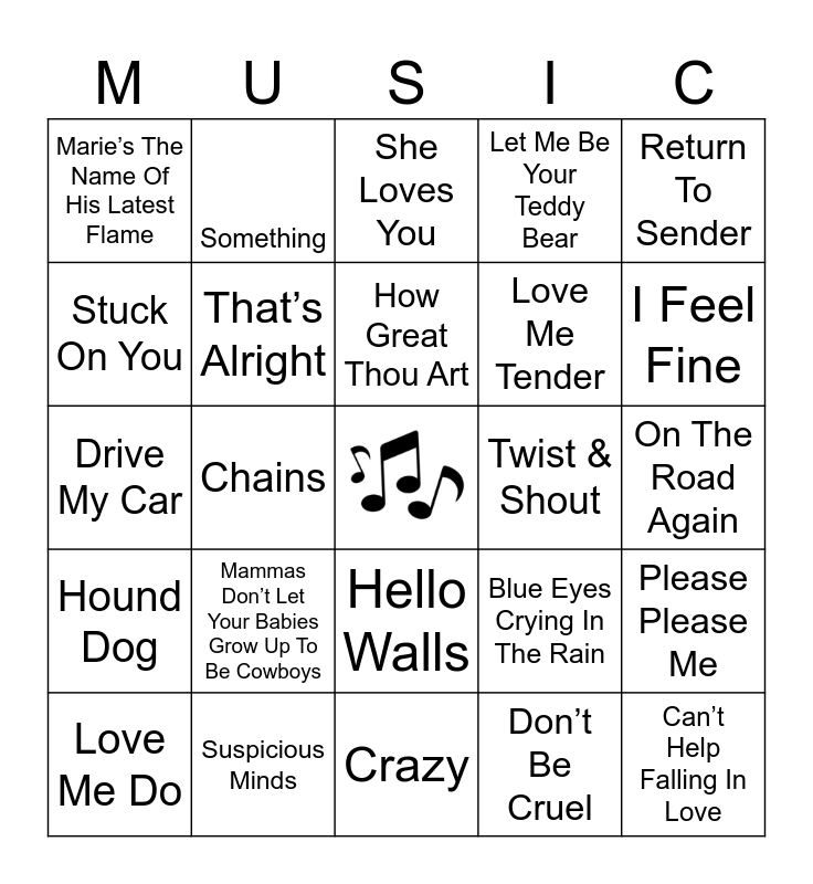 This bingo card has a free space and 60 words: Money Honey, Suspicious Minds, Burning Love, Hound Dog, Don’t Be Cruel, Heartbreak Hotel, That’s Alright, Blue Suede Shoes, Love Me Tender, All Shook Up, Let Me Be Your Teddy Bear, Jailhouse Rock, Stuck On You, It's Now Or Never, Are You Lonesome Tonight, Marie’s The Name Of His Latest Flame, Can’t Help Falling In Love, Return To Sender, Crying In The Chapel, How Great Thou Art, Twist & Shout, She Loves You, Love Me Do, Please Please Me, I Want To Hold Your Hand, Can’t Buy Me Love, A Hard Day’s Night, And I Love Her, I Feel Fine, Yesterday, Hey Jude, Get Back, Don’t Let Me Down, Here Comes The Sun, Something, I Need You, You’re Going To Lose That Girl, Chains, In My Life, Drive My Car, Highwayman, Mammas Don’t Let Your Babies Grow Up To Be Cowboys, On The Road Again, Poncho & Lefty, Blue Eyes Crying In The Rain, Shotgun Willie, Whiskey River, Georgia On My Mind, Midnight Rider, Hello Walls, Crazy, City Of New Orleans, Angel Flying Too Close to the Ground, To All the Girls I’ve Loved Before, Funny How Time Slips Away, Just Breathe, The Last Thing I Needed The First Thing This Morning, Me and Paul, If You’ve Got the Money I’ve Got The Time and My Heroes Have Always Been Cowboys.