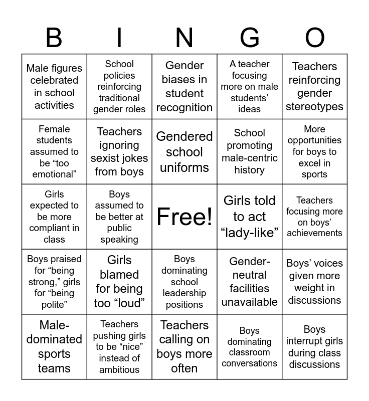 This bingo card has a free space and 25 words: Girls blamed for being too “loud”, Teachers calling on boys more often, Gendered school uniforms, Male-dominated sports teams, Teachers reinforcing gender stereotypes, Male figures celebrated in school activities, Female students assumed to be “too emotional”, School policies reinforcing traditional gender roles, Girls told to act “lady-like”, Boys dominating school leadership positions, School promoting male-centric history, Girls expected to be more compliant in class, Gender-neutral facilities unavailable, Boys’ voices given more weight in discussions, Teachers ignoring sexist jokes from boys, Less encouragement for girls to join leadership, Teachers focusing more on boys’ achievements, Gender biases in student recognition, More opportunities for boys to excel in sports, Boys assumed to be better at public speaking, Boys interrupt girls during class discussions, Teachers pushing girls to be “nice” instead of ambitious, Boys praised for “being strong,” girls for “being polite”, A teacher focusing more on male students’ ideas and Boys dominating classroom conversations.