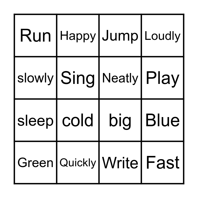 This bingo card has 16 words: Quickly, Blue, Jump, Run, sleep, Happy, big, Write, slowly, Sing, Green, Loudly, cold, Play, Neatly and Fast.