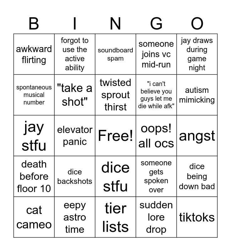 This bingo card has a free space and 24 words: dice backshots, eepy astro time, twisted sprout thirst, cat cameo, jay draws during game night, awkward flirting, spontaneous musical number, forgot to use the active ability, oops! all ocs, dice stfu, "i can't believe you guys let me die while afk", jay stfu, someone gets spoken over, dice being down bad, "take a shot", sudden lore drop, angst, soundboard spam, autism mimicking, elevator panic, tiktoks, death before floor 10, someone joins vc mid-run and tier lists.