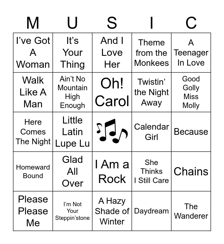 This bingo card has a free space and 60 words: I’m Down, I’m Not Your Steppin’stone, Boys, Homeward Bound, Daydream, Let’s Get it On, Ain’t No Mountain High Enough, You Send Me, Twistin’ the Night Away, Come On Let’s Go, Theme from the Monkees, Pleasant Valley Sunday, Walk Like A Man, Wouldn’t it Be Nice, I Can’t Stop Loving You, I’ve Got A Woman, The Wanderer, A Teenager In Love, Abraham, Maritn & John, Oh! Carol, Calendar Girl, And I Love Her, Please Please Me, Chains, Money Honey, Heartbreak Hotel, Hound Dog, Wild One, Good Golly Miss Molly, Rip It Up, The Twist, Limbo Rock, The Stroll, This Old Heart Of Mine, It’s Your Thing, Dream Lover, Teenager In Love, Little Latin Lupe Lu, Baby Please Don’t Go, Here Comes The Night, All I Really Want To Do, Glad All Over, Because, Can’t you See That She’s Mine, She Thinks I Still Care, I Fall To Pieces, Funny How Time Slips Away, Cryin’ Time, Make the World Go Away, I Am a Rock, A Hazy Shade of Winter, Draggin’ The Line, Mirage, Baby Love, You Keep Me Hangin’ On, I Can’t Help Myself, You Can’t Hurry Love, Little Deuce Coupe, Dance Dance Dance and Help Me Rhonda.