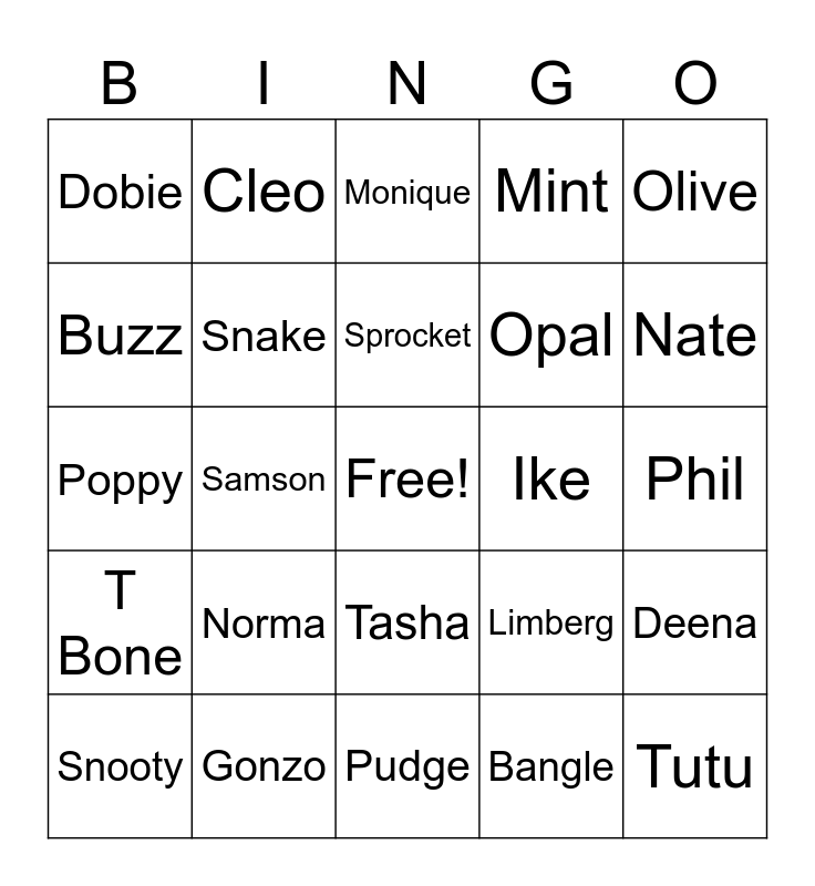 This bingo card has a free space and 24 words: Norma, Gonzo, Sprocket, Snooty, Olive, Dobie, Buzz, Cleo, Ike, Tasha, Opal, Poppy, Limberg, Deena, Snake, Bangle, Phil, Monique, Nate, Samson, Tutu, T Bone, Mint and Pudge.