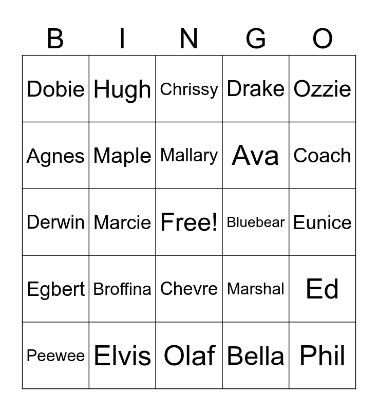 This bingo card has a free space and 298 words: Admiral, Agent S, Agnes, Al, Alfonso, Alice, Alli, Amelia, Anabelle, Anchovy, Angus, Anicotti, Ankha, Annalisa, Annalise, Antonio, Apollo, Apple, Astrid, Audie, Aurora, Ava, Avery, Axel, Baabara, Bam, Bangle, Barold, Bea, Beardo, Beau, Becky, Bella, Benedict, Benjamin, Bertha, Bettina, Bianca, Biff, Big Top, Bill, Billy, Biskit, Bitty, Blaire, Blanche, Bluebear, Bob, Bonbon, Bones, Boomer, Boone, Boots, Boris, Boyd, Bree, Broccolo, Broffina, Bruce, Bubbles, Buck, Bud, Bunnie, Butch, Buzz, Cally, Camofrog, Canberra, Candi, Carmen, Caroline, Carrie, Cashmere, Celia, Cesar, Chadder, Charlise, Cheri, Cherry, Chester, Chevre, Chief, Chops, Chow, Chrissy, Claude, Claudia, Clay, Cleo, Clyde, Coach, Cobb, Coco, Cole, Colton, Cookie, Cousteau, Cranston, Croque, Cube, Curlos, Curly, Curt, Cyd, Cyrano, Daisy, Deena, Deirdre, Del, Deli, Derwin, Diana, Diva, Dizzy, Dobie, Doc, Dom, Dora, Dotty, Drago, Drake, Drift, Ed, Egbert, Elise, Ellie, Elmer, Eloise, Elvis, Erik, Eugene, Eunice, Fang, Fauna, Felicity, Filbert, Flip, Flo, Flora, Flurry, Francine, Frank, Freckles, Freya, Friga, Frita, Frobert, Fuchsia, Gabi, Gala, Gaston, Gayle, Genji, Gigi, Gladys, Gloria, Goldie, Gonzo, Goose, Graham, Greta, Grizzly, Groucho, Gruff, Gwen, Hamlet, Hamphrey, Hans, Harry, Hazel, Henry, Hippeux, Hopkins, Hopper, Hornsby, Huck, Hugh, Iggly, Ike, Jacob, Jacques, Jambette, Jay, Jeremiah, Jitters, Joey, Judy, Julia, Julian, June, Kabuki, Katt, Keaton, Ken, Ketchup, Kevin, Kid Cat, Kidd, Kiki, Kitt, Kitty, Klaus, Knox, Kody, Kyle, Leonardo, Leopold, Lily, Limberg, Lionel, Lobo, Lolly, Lopez, Louie, Lucha, Lucky, Lucy, Lyman, Mac, Maddie, Maelle, Maggie, Mallary, Maple, Marcel, Marcie, Margie, Marina, Marshal, Mathilda, Megan, Melba, Merengue, Merry, Midge, Mint, Mira, Miranda, Mitzi, Moe, Molly, Monique, Monty, Moose, Mott, Muffy, Murphy, Nan, Nana, Nate, Nibbles, Norma, O'Hare, Octavian, Olaf, Olive, Olivia, Opal, Ozzie, Pancetti, Pango, Paolo, Papi, Pashmina, Pate, Patty, Paula, Peaches, Peanut, Pecan, Peck, Peewee, Peggy, Pekoe, Penelope, Phil, Phoebe, Pierce, Pietro, Pinky, Piper, Pippy, Plucky, Pompom, Poncho, Poppy, Portia, Prince, Puck, Puddles, Pudge, Punchy, Purrl, Queenie, Quillson, Raddle, Rasher and Raymond.