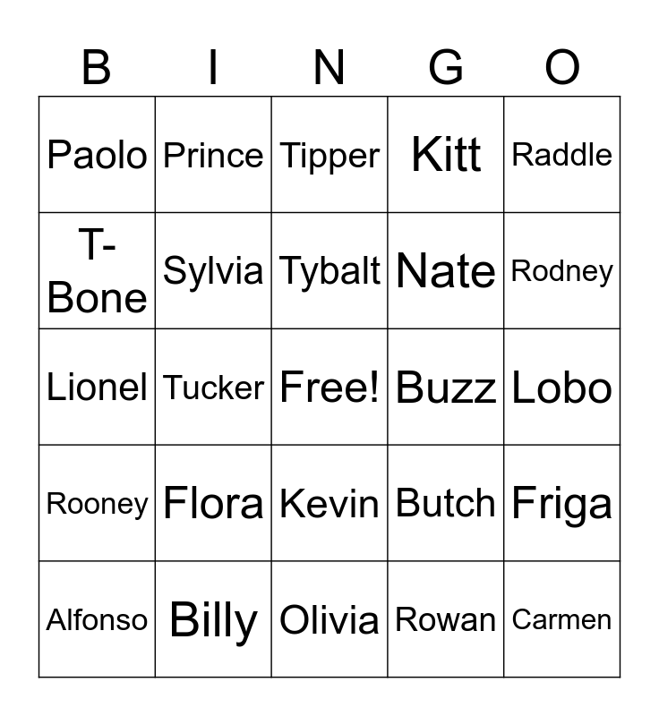 This bingo card has a free space and 388 words: Admiral, Agent S, Agnes, Al, Alfonso, Alice, Alli, Amelia, Anabelle, Anchovy, Angus, Anicotti, Ankha, Annalisa, Annalise, Antonio, Apollo, Apple, Astrid, Audie, Aurora, Ava, Avery, Axel, Baabara, Bam, Bangle, Barold, Bea, Beardo, Beau, Becky, Bella, Benedict, Benjamin, Bertha, Bettina, Bianca, Biff, Big Top, Bill, Billy, Biskit, Bitty, Blaire, Blanche, Bluebear, Bob, Bonbon, Bones, Boomer, Boone, Boots, Boris, Boyd, Bree, Broccolo, Broffina, Bruce, Bubbles, Buck, Bud, Bunnie, Butch, Buzz, Cally, Camofrog, Canberra, Candi, Carmen, Caroline, Carrie, Cashmere, Celia, Cesar, Chadder, Charlise, Cheri, Cherry, Chester, Chevre, Chief, Chops, Chow, Chrissy, Claude, Claudia, Clay, Cleo, Clyde, Coach, Cobb, Coco, Cole, Colton, Cookie, Cousteau, Cranston, Croque, Cube, Curlos, Curly, Curt, Cyd, Cyrano, Daisy, Deena, Deirdre, Del, Deli, Derwin, Diana, Diva, Dizzy, Dobie, Doc, Dom, Dora, Dotty, Drago, Drake, Drift, Ed, Egbert, Elise, Ellie, Elmer, Eloise, Elvis, Erik, Eugene, Eunice, Fang, Fauna, Felicity, Filbert, Flip, Flo, Flora, Flurry, Francine, Frank, Freckles, Freya, Friga, Frita, Frobert, Fuchsia, Gabi, Gala, Gaston, Gayle, Genji, Gigi, Gladys, Gloria, Goldie, Gonzo, Goose, Graham, Greta, Grizzly, Groucho, Gruff, Gwen, Hamlet, Hamphrey, Hans, Harry, Hazel, Henry, Hippeux, Hopkins, Hopper, Hornsby, Huck, Hugh, Iggly, Ike, Jacob, Jacques, Jambette, Jay, Jeremiah, Jitters, Joey, Judy, Julia, Julian, June, Kabuki, Katt, Keaton, Ken, Ketchup, Kevin, Kid Cat, Kidd, Kiki, Kitt, Kitty, Klaus, Knox, Kody, Kyle, Leonardo, Leopold, Lily, Limberg, Lionel, Lobo, Lolly, Lopez, Louie, Lucha, Lucky, Lucy, Lyman, Mac, Maddie, Maelle, Maggie, Mallary, Maple, Marcel, Marcie, Margie, Marina, Marshal, Mathilda, Megan, Melba, Merengue, Merry, Midge, Mint, Mira, Miranda, Mitzi, Moe, Molly, Monique, Monty, Moose, Mott, Muffy, Murphy, Nan, Nana, Nate, Nibbles, O'Hare, Octavian, Olaf, Olive, Olivia, Opal, Ozzie, Pancetti, Pango, Paolo, Papi, Pashmina, Pate, Paula, Peaches, Peanut, Pecan, Peck, Peewee, Peggy, Pekoe, Penelope, Phil, Phoebe, Pierce, Pietro, Pinky, Piper, Pippy, Plucky, Pompom, Poncho, Poppy, Portia, Prince, Puck, Puddles, Pudge, Punchy, Purrl, Queenie, Quillson, Raddle, Rasher, Raymond, Renée, Reneigh, Rex, Rhonda, Ribbot, Ricky, Rizzo, Roald, Robin, Rocco, Rocket, Rod, Rodeo, Rodney, Rolf, Rooney, Rory, Roscoe, Rosie, Rowan, Ruby, Rudy, Sally, Samson, Sandy, Savannah, Scoot, Shari, Sheldon, Shep, Sherb, Simon, Skye, Sly, Snake, Snooty, Soleil, Sparro, Spike, Spork, Sprinkle, Sprocket, Static, Stella, Sterling, Stinky, Stitches, Stu, Sydney, Sylvana, Sylvia, T-Bone, Tabby, Tad, Tammi, Tammy, Tangy, Tank, Tasha, Teddy, Tex, Tia, Tiffany, Timbra, Tipper, Tom, Truffles, Tucker, Tutu, Twiggy, Tybalt, Ursala, Velma, Vesta, Vic, Victoria, Violet, Vivian, Vladimir, Wade, Walker, Walt, Wart Jr., Weber, Wendy, Whitney, Willow, Winnie, Wolfgang, Yuka, Zell and Zucker.