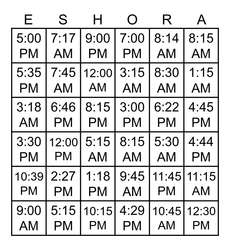 This bingo card has 90 words: 12:45 PM, 1:45 PM, 4:45 PM, 5:45 PM, 6:45 PM, 8:45 PM, 9:45 PM, 11:45 PM, 11:30 AM, 1:15 PM, 2:15 PM, 4:15 PM, 5:15 PM, 8:15 PM, 6:45 AM, 7:45 AM, 9:45 AM, 10:45 AM, Free!, 12:30 AM, 2:30 AM, 4:30 AM, 5:30 AM, 7:30 AM, 8:30 AM, 8:15 AM, 10:15 AM, 11:15 AM, 6:00 AM, 7:00 AM, 9:00 AM, 12:00 PM, 1:00 PM, 3:00 PM, 5:00 PM, 7:00 PM, 9:00 PM, 11:00 PM, 1:15 AM, 3:15 AM, 5:15 AM, 8:15 AM, 10:15 PM, 12:30 PM, 2:30 PM, 3:30 PM, 6:30 PM, 7:30 PM, 10:30 PM, 1:45 AM, 3:45 AM, 12:00 AM, 2:00 AM, 4:00 AM, 5:05 PM, 1:20 PM, 6:46 PM, 9:52 AM, 10:01 AM, 4:29 PM, 2:27 PM, 3:13 AM, 10:10 AM, 7:55 PM, 5:05 PM, 12:12 AM, 1:59 PM, 4:44 PM, 8:29 PM, 10:35 PM, 6:22 PM, 3:18 AM, 1:18 PM, 6:54 PM, 7:17 AM, 5:35 PM, 9:18 AM, 6:09 PM, 5:22 PM, 1:11 PM, 10:39 PM, 8:14 AM, 7:49 AM, 4:56 PM, 9:23 AM, 1:13 AM, 2:16 PM, 4:56 PM, 4:08 AM and 5:55 PM.