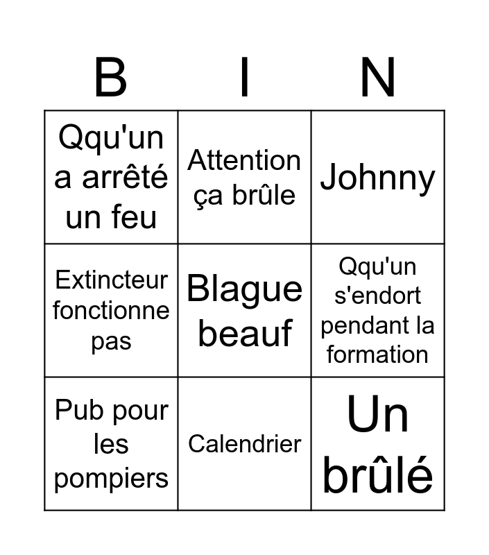This bingo card has a free space and 8 words: Qqu'un s'endort pendant la formation, Johnny, Attention ça brûle, Pub pour les pompiers, Qqu'un a arrêté un feu, Un brûlé, Extincteur fonctionne pas and Calendrier.