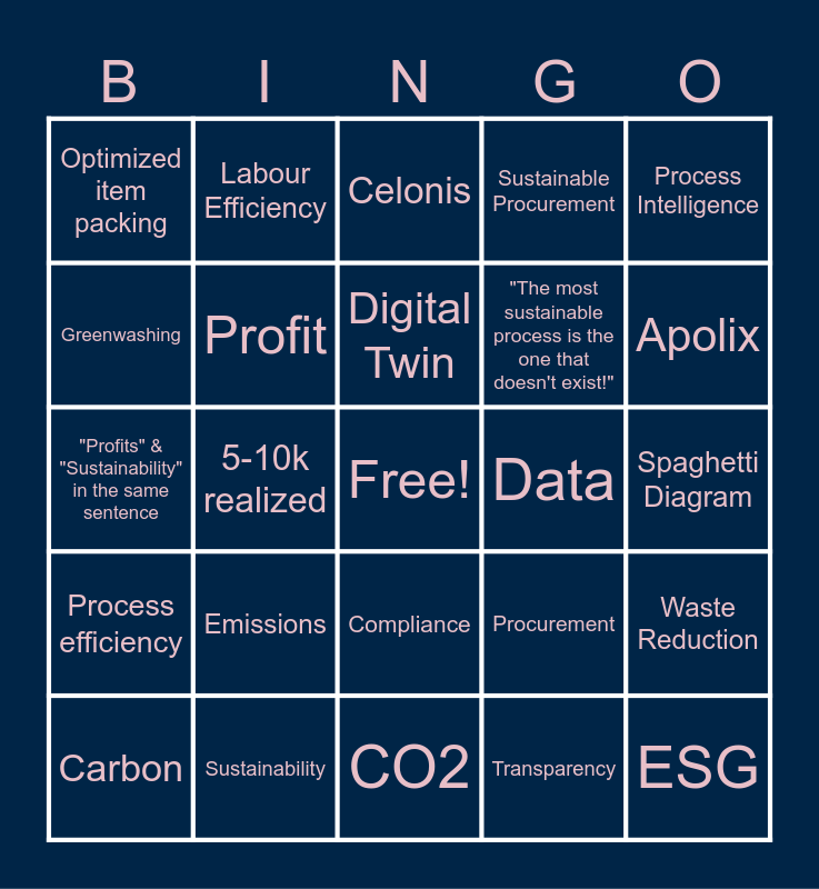 This bingo card has a free space and 24 words: Emissions, Sustainability, Digital Twin, Carbon, Process Intelligence, Optimized item packing, Greenwashing, Labour Efficiency, Data, Compliance, "The most sustainable process is the one that doesn't exist!", "Profits" & "Sustainability" in the same sentence, Procurement, Waste Reduction, Profit, Transparency, Spaghetti Diagram, Celonis, Apolix, 5-10k realized, ESG, Process efficiency, Sustainable Procurement and CO2.