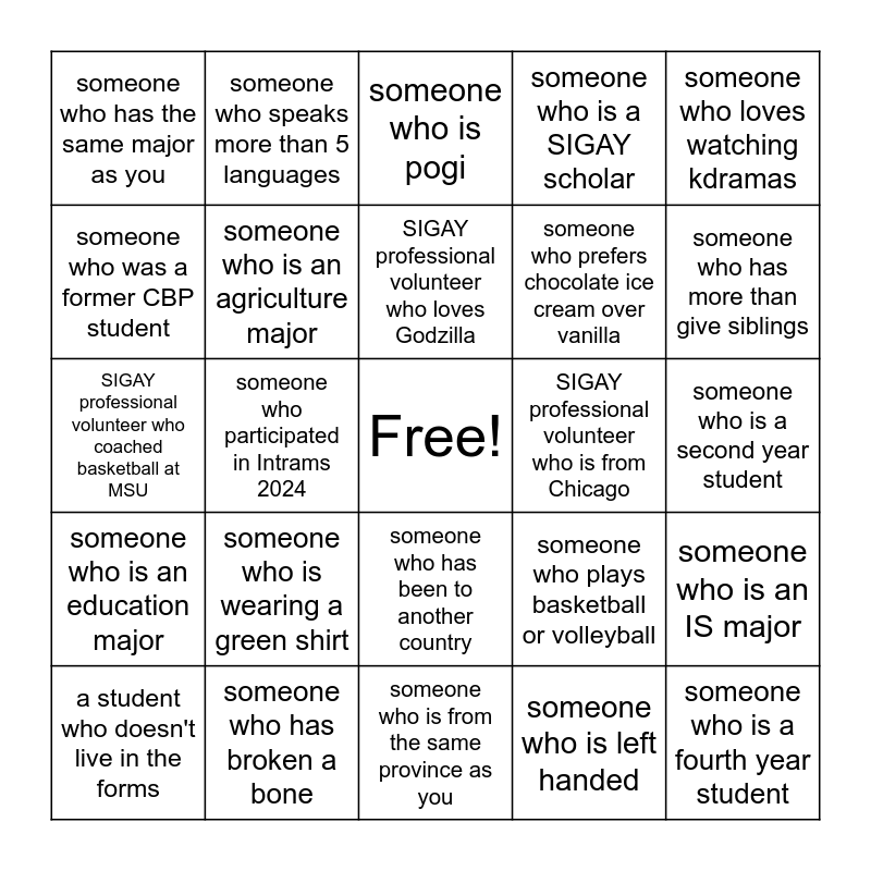 This bingo card has a free space and 28 words: someone who is an IS major, someone who is a SIGAY volunteer, someone who prefers chocolate ice cream over vanilla, someone who is left handed, someone who was a former CBP student, someone who is pogi, someone who speaks more than 5 languages, someone who is an education major, SIGAY professional volunteer who is from Chicago, a student who doesn't live in the forms, SIGAY professional volunteer who coached basketball at MSU, someone who is a SIGAY scholar, someone who has broken a bone, someone who is from the same province as you, someone who has more than give siblings, someone who is maganda, someone who is wearing a green shirt, someone who is an agriculture major, SIGAY professional volunteer who loves Godzilla, someone who has been to another country, someone who has the same major as you, SIGAY professional volunteer who is from Taiwan, someone who is a fourth year student, someone who participated in Intrams 2024, someone who is a second year student, someone who plays basketball or volleyball, someone who loves watching kdramas and someone who has a sibling that is older than them.