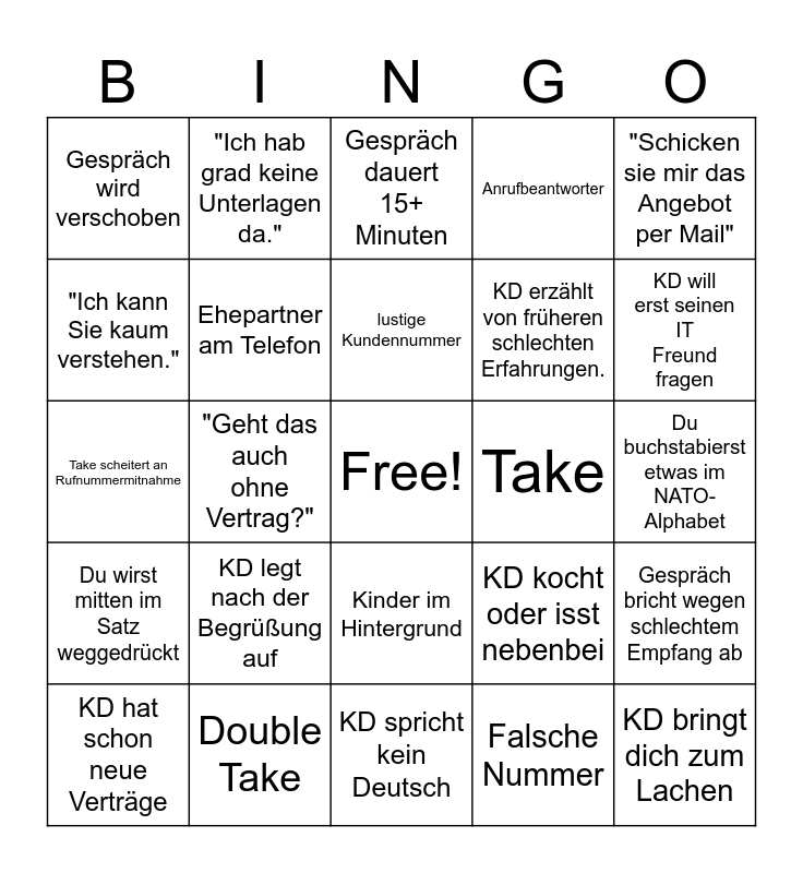 This bingo card has a free space and 24 words: KD legt nach der Begrüßung auf, Double Take, lustige Kundennummer, KD hat schon neue Verträge, "Schicken sie mir das Angebot per Mail", Gespräch wird verschoben, "Ich kann Sie kaum verstehen.", "Ich hab grad keine Unterlagen da.", Take, Kinder im Hintergrund, KD erzählt von früheren schlechten Erfahrungen., Take scheitert an Rufnummermitnahme, KD kocht oder isst nebenbei, Gespräch bricht wegen schlechtem Empfang ab, Ehepartner am Telefon, Falsche Nummer, Du buchstabierst etwas im NATO-Alphabet, Gespräch dauert 15+ Minuten, KD will erst seinen IT Freund fragen, "Geht das auch ohne Vertrag?", KD bringt dich zum Lachen, Du wirst mitten im Satz weggedrückt, Anrufbeantworter and KD spricht kein Deutsch.
