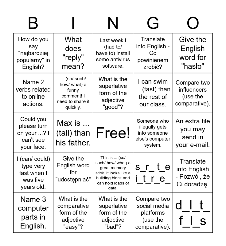 This bingo card has a free space and 24 words: Give the English word for "udostępniać", What is the comparative form of the adjective "easy"?, What is the superlative form of the adjective "good"?, Name 3 computer parts in English., Give the English word for "hasło", How do you say "najbardziej popularny" in English?, Name 2 verbs related to online actions., What does "reply" mean?, Someone who illegally gets into someone else's computer system., This is ... (so/ such/ how/ what) a great memory stick. It looks like a building block and can hold loads of data., I can swim ... (fast) than the rest of our class., Could you please turn on your ...? I can't see your face., s_r_ t_e i_t_r_e_, Translate into English - Pozwól, że Ci doradzę., ... (so/ such/ how/ what) a funny comment! I need to share it quickly., Compare two social media platforms (use the comparative)., An extra file you may send in your e-mail., Last week I (had to/ have to) install some antivirus software., Compare two influencers (use the comparative)., Max is ... (tall) than his father., d_l_t_ f_l_s, I (can/ could) type very fast when I was five years old., Translate into English - Co powinienem zrobić? and What is the superlative form of the adjective "bad"?.