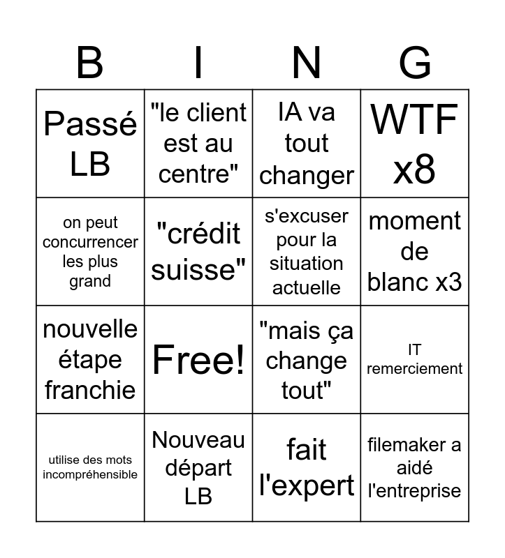This bingo card has 16 words: Nouveau départ LB, IT remerciement, IA va tout changer, Passé LB, nouvelle étape franchie, "le client est au centre", "mais ça change tout", fait l'expert, on peut concurrencer les plus grand, "crédit suisse", utilise des mots incompréhensible, WTF x8, Free!, moment de blanc x3, s'excuser pour la situation actuelle and filemaker a aidé l'entreprise.