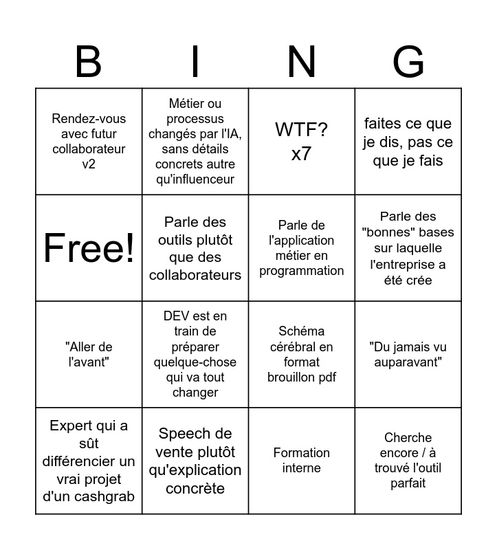 This bingo card has 16 words: Speech de vente plutôt qu'explication concrète, "Du jamais vu auparavant", WTF? x7, Rendez-vous avec futur collaborateur v2, "Aller de l'avant", Métier ou processus changés par l'IA, sans détails concrets autre qu'influenceur, Schéma cérébral en format brouillon pdf, Formation interne, Free!, Parle des outils plutôt que des collaborateurs, Expert qui a sût différencier un vrai projet d'un cashgrab, faites ce que je dis, pas ce que je fais, DEV est en train de préparer quelque-chose qui va tout changer, Parle des "bonnes" bases sur laquelle l'entreprise a été crée, Parle de l'application métier en programmation and Cherche encore / à trouvé l'outil parfait.