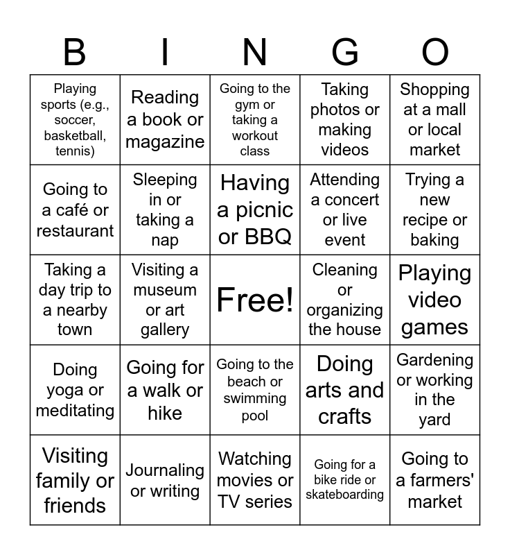 This bingo card has a free space and 25 words: Going for a walk or hike, Watching movies or TV series, Having a picnic or BBQ, Visiting family or friends, Shopping at a mall or local market, Playing sports (e.g., soccer, basketball, tennis), Going to a café or restaurant, Reading a book or magazine, Cleaning or organizing the house, Going to the beach or swimming pool, Attending a concert or live event, Taking a day trip to a nearby town, Doing arts and crafts, Gardening or working in the yard, Sleeping in or taking a nap, Volunteering or joining a community event, Playing video games, Going to the gym or taking a workout class, Trying a new recipe or baking, Visiting a museum or art gallery, Going to a farmers' market, Journaling or writing, Doing yoga or meditating, Taking photos or making videos and Going for a bike ride or skateboarding.