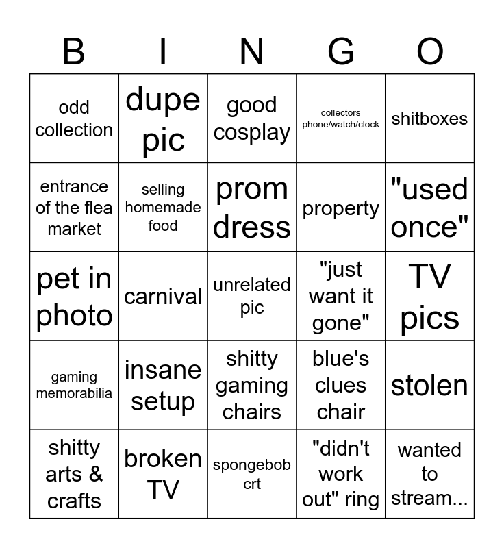 This bingo card has 47 words: $100k+, unrelated pic, lingerie, spongebob crt, insane setup, cheap collectible, dupe pic, pc w/ no specs, entrance of the flea market, crown royale bag bundle, selling homemade food, collectors phone/watch/clock, stolen, blue's clues chair, farm equipment, AI slop, prom dress, "just want it gone", trump merch, shitboxes, carnival, "didn't work out" ring, odd collection, property, work clothing, "used once", shitty arts & crafts, uranium, shitty gaming chairs, gaming memorabilia, weird furniture, aura bed, ATM, arcade, broken vending machine, broken TV, TV pics, assorted vehicle, weird shoes, KKona, wanted to stream..., good cosplay, pet in photo, feet, bulk listings, graduation attire and costume.