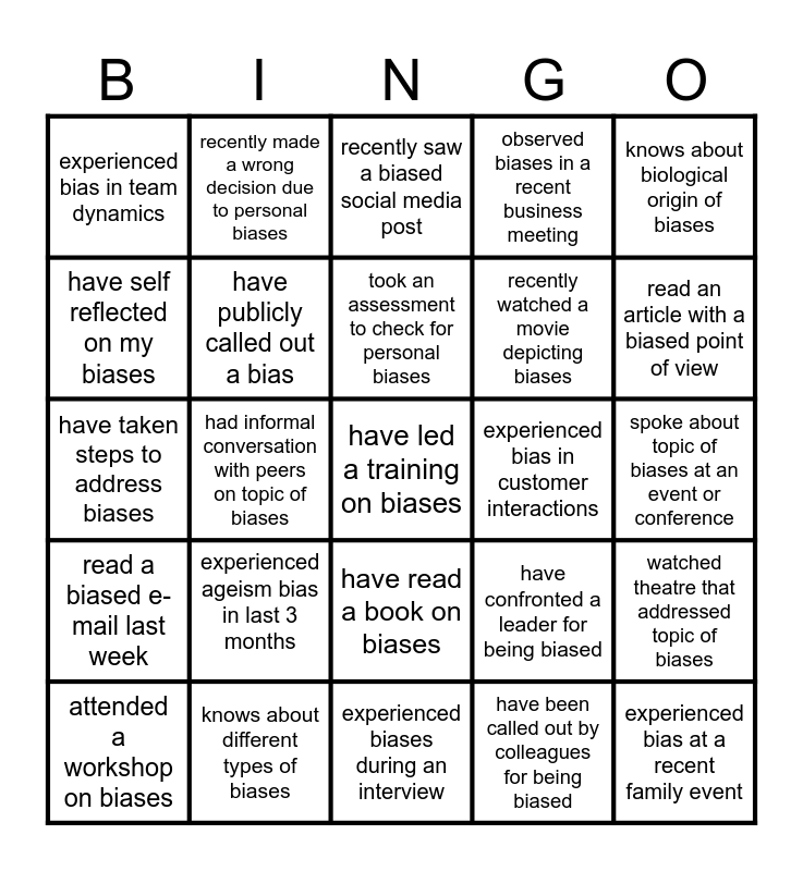 This bingo card has 25 words: experienced ageism bias in last 3 months, experienced biases during an interview, took an assessment to check for personal biases, attended a workshop on biases, knows about biological origin of biases, experienced bias in team dynamics, have self reflected on my biases, recently made a wrong decision due to personal biases, experienced bias in customer interactions, have read a book on biases, recently watched a movie depicting biases, have taken steps to address biases, have confronted a leader for being biased, watched theatre that addressed topic of biases, have publicly called out a bias, experienced bias at a recent family event, spoke about topic of biases at an event or conference, recently saw a biased social media post, read an article with a biased point of view, had informal conversation with peers on topic of biases, have led a training on biases, knows about different types of biases, read a biased e-mail last week, observed biases in a recent business meeting and have been called out by colleagues for being biased.