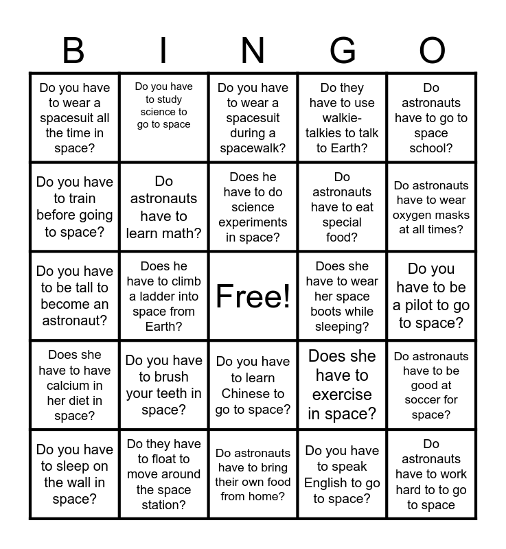 This bingo card has a free space and 24 words: Do you have to brush your teeth in space?, Do they have to float to move around the space station?, Does he have to do science experiments in space?, Do you have to sleep on the wall in space?, Do astronauts have to go to space school?, Do you have to wear a spacesuit all the time in space?, Do you have to train before going to space?, Do you have to study science to go to space, Does she have to wear her space boots while sleeping?, Do you have to learn Chinese to go to space?, Do astronauts have to eat special food?, Do you have to be tall to become an astronaut?, Does she have to exercise in space?, Do astronauts have to be good at soccer for space?, Do astronauts have to learn math?, Do you have to speak English to go to space?, Do you have to be a pilot to go to space?, Do you have to wear a spacesuit during a spacewalk?, Do astronauts have to wear oxygen masks at all times?, Does he have to climb a ladder into space from Earth?, Do astronauts have to work hard to to go to space, Does she have to have calcium in her diet in space?, Do they have to use walkie-talkies to talk to Earth? and Do astronauts have to bring their own food from home?.