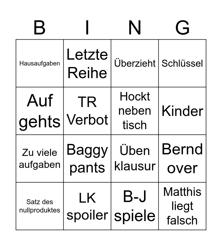 This bingo card has 16 words: Satz des nullproduktes, LK spoiler, Überzieht, Schlüssel, Auf gehts, Letzte Reihe, Üben klausur, Bernd over, Hausaufgaben, TR Verbot, B-J spiele, Kinder, Zu viele aufgaben, Baggy pants, Hockt neben tisch and Matthis liegt falsch.