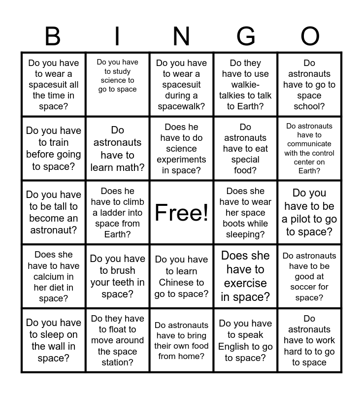 This bingo card has a free space and 24 words: Do you have to brush your teeth in space?, Do they have to float to move around the space station?, Does he have to do science experiments in space?, Do you have to sleep on the wall in space?, Do astronauts have to go to space school?, Do you have to wear a spacesuit all the time in space?, Do you have to train before going to space?, Do you have to study science to go to space, Does she have to wear her space boots while sleeping?, Do you have to learn Chinese to go to space?, Do astronauts have to eat special food?, Do you have to be tall to become an astronaut?, Does she have to exercise in space?, Do astronauts have to be good at soccer for space?, Do astronauts have to learn math?, Do you have to speak English to go to space?, Do you have to be a pilot to go to space?, Do you have to wear a spacesuit during a spacewalk?, Do astronauts have to communicate with the control center on Earth?, Does he have to climb a ladder into space from Earth?, Do astronauts have to work hard to to go to space, Does she have to have calcium in her diet in space?, Do they have to use walkie-talkies to talk to Earth? and Do astronauts have to bring their own food from home?.