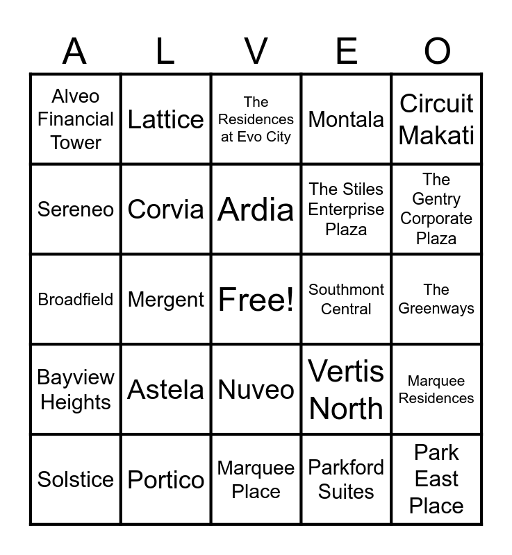 This bingo card has a free space and 49 words: Ametrine, Park East Place, Orean Residences, Marquee Place, Astela, Sentrove, Lattice, Versala, Sereneo, Centrala, Corvia, Montala, Marquee Residences, Vertis North, Cerca, Viento, Ardia, Southmont Central, Cerule, Circuit Makati, Mergent, Parkford Suites, Alveo Financial Tower, The Stiles Enterprise Plaza, Tryne Enterprise Plaza, The Gentry Corporate Plaza, Solstice, Callisto, Nuveo, Bayview Heights, Park Cascades, Orean Place, High Park, Patio Suites, Portico, Parklinks, Caleia, Vermosa, The Greenways, Hillside Ridge, South Palm Grove, Verdea, Alveo Park Triangle Tower, Park Triangle Corporate Plaza, Broadfield, The Residences at Evo City, Evo City Commercial, Palatine and Mondia.
