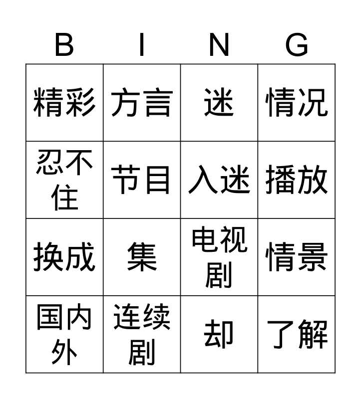 This bingo card has 16 words: 连续剧, 情景, 迷, 精彩, 换成, 方言, 电视剧, 却, 忍不住, 节目, 国内外, 情况, 集, 播放, 入迷 and 了解.