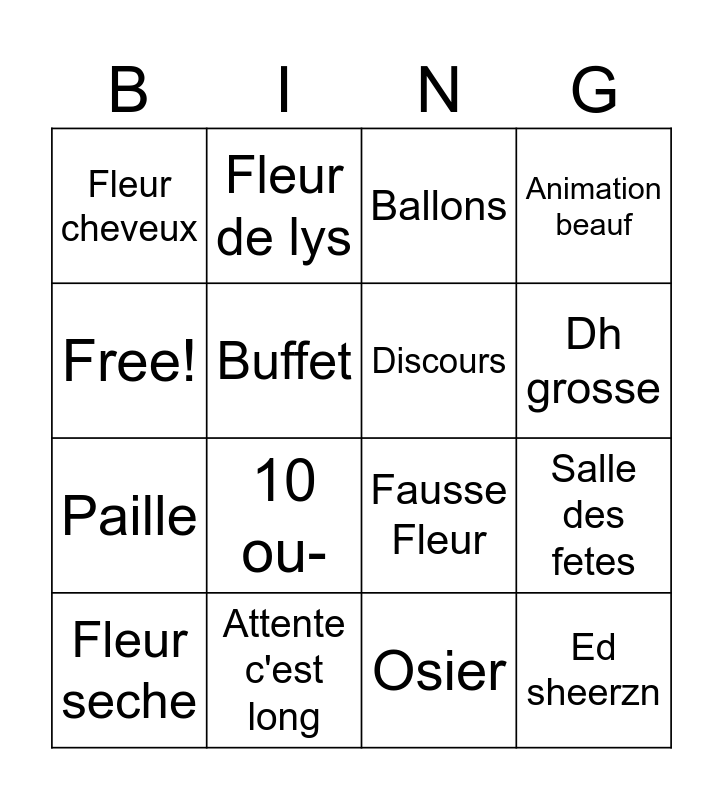 This bingo card has 16 words: Attente c'est long, Salle des fetes, Ballons, Fleur cheveux, Paille, Fleur de lys, Fausse Fleur, Osier, Free!, Buffet, Fleur seche, Animation beauf, 10 ou-, Dh grosse, Discours and Ed sheerzn.