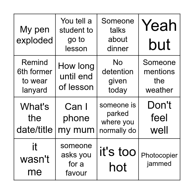 This bingo card has 32 words: Can I borrow a pen, I forgot my homework, Don't feel well, Student late to lesson, Photocopier jammed, No detention given today, Remind 6th former to wear lanyard, Remind student about uniform, You tell a student to go to lesson, You need to ask a student to stop talking, Someone mentions the weather, Someone talks about dinner, Sports result is mentioned, You have got your emails to single figures, someone asks you for a favour, someone replies all to an email, you get an email with an emoji, someone is parked where you normally do, someone asks you a 'quick question', you do the tea run, you forget your password, can you get on call, it's too hot, you didn't tell us, it wasn't me, Yeah but, What's the date/title, How long until end of lesson, My pen exploded, Can you phone home, can I talk to you a minute and Can I phone my mum.