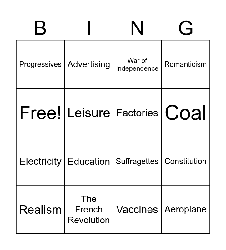 This bingo card has 16 words: The French Revolution, Constitution, War of Independence, Progressives, Electricity, Advertising, Suffragettes, Vaccines, Free!, Leisure, Realism, Romanticism, Education, Coal, Factories and Aeroplane.